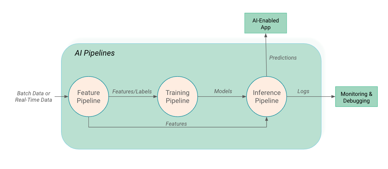 An AI Pipeline is a program that takes input and produces one or more ML artifacts as output. Typically, an AI pipeline is one of the following: a feature pipeline, a training pipeline, or an inference pipeline.