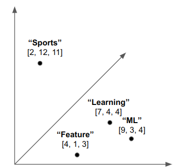 The above figure shows a Word Embedding with Dimensionality of Length 3. That is, each word is encoded as a vector of length 3 using a Word Embedding model. Notice that “ML” and “Learning” are close in embedding space, but “Sports” is far away. “Feature” is close to “Learning” and “ML”. In this example, if you searched for the closest word to “ML”, you would find the word “Learning”.