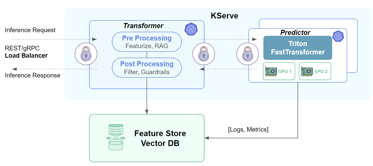 Figure 1: KServe makes ML models available as network accessible services via a REST or gRPC API. ML models typically require external data sources, such as a feature store or Vector DB, for enriched feature vectors or retrieval augmented generation (RAG).