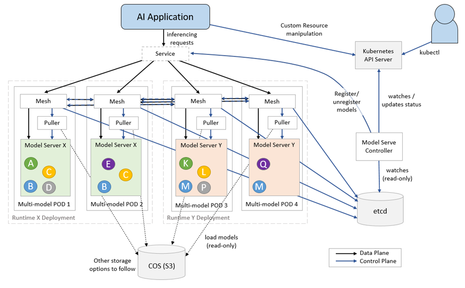 The architecture involves a controller Pod orchestrating model runtime Deployments and a Service that accepts inferencing requests, with a routing layer ensuring optimal model loading. Incoming requests are directed to ModelMesh Serving, and model data is pulled from external storage instances, currently supporting S3-based object storage with plans for more storage options.