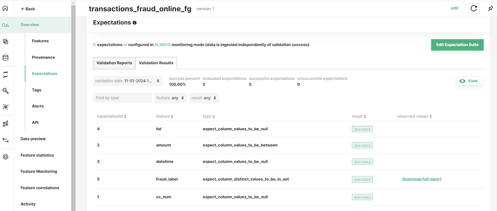 For example, Hopsworks includes support for Great Expectations and visualizes the result of data validation runs in the platform, see below. In the event that data validation tests fail, an alert can be sent to a slack channel, email, or PagerDuty.