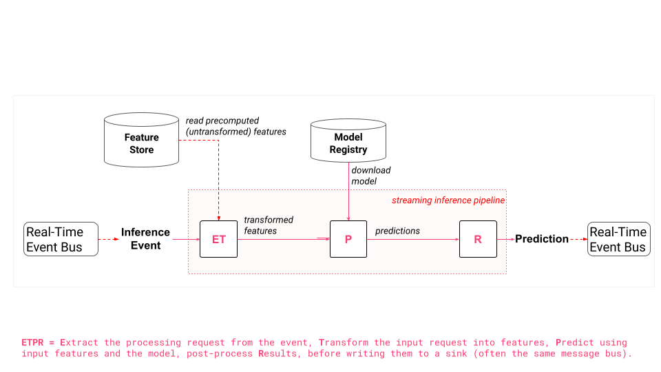 A streaming inference pipeline is a streaming application that makes real-time, non-interactive predictions triggered by the arrival of an event and outputs predictions to some sink (such as the event bus).
