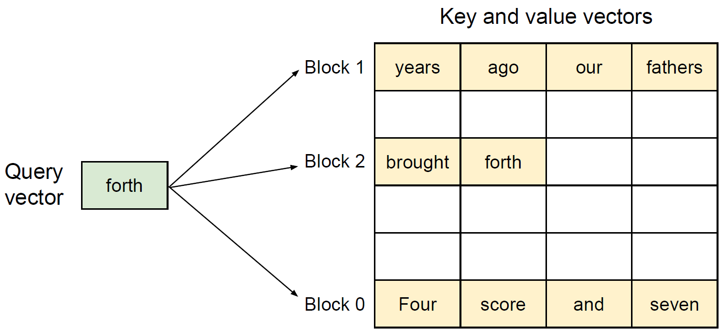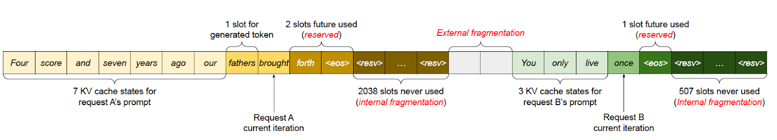 The attention mechanism allows LLMs to focus on relevant parts of the input sequence while generating output/response. Inside the attention mechanism, the attention scores for all input tokens need to be calculated. Existing systems store KV pairs in contiguous memory spaces, limiting memory sharing and leading to inefficient memory management.