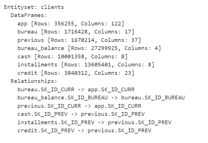 Ingesting multiple tables and establishing relationships is a vital part of FeatureTools. Let’s see how we can work with a custom dataset. For this exercise, we will use the Home Credit Default Risk dataset.