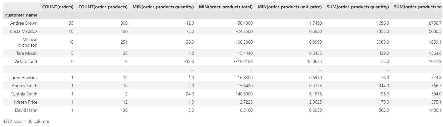 The code snippet calls the `.dfs` function from the library. The function takes the EntitySet, the main dataframe name, and the type of transformations required to build the features. Let’s take a look at what the output looks like.