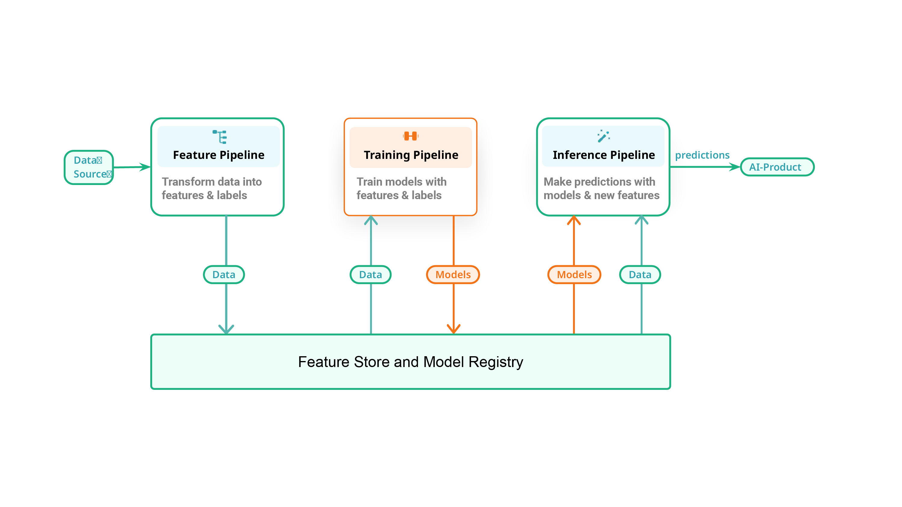 Figure 2: Hopsworks role in building resilient ML/AI Systems. The System is made up of three individual pipelines; feature pipelines, training pipelines and inference pipelines.