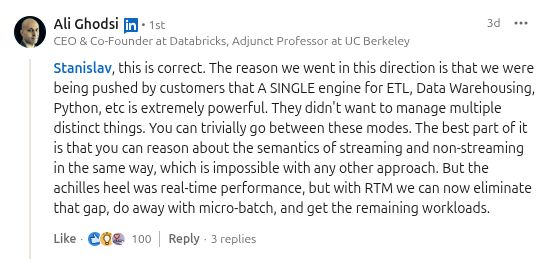 I think Ali Ghodsi is wrong here. He is claiming that the direction of travel is to a single engine (Spark) for batch, Python, and streaming workloads.