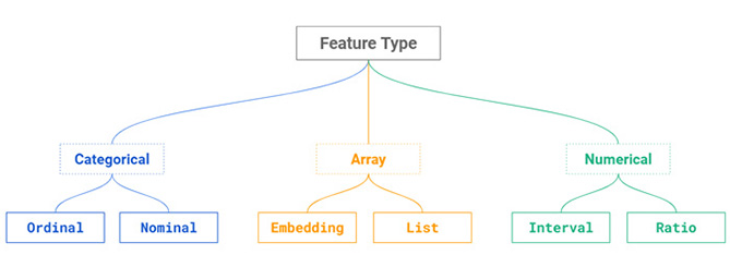 Frisch gebackene Programmierer sind mit Strings, Int und Booleans vertraut. Programmiersprachen unterstützen Datentypen auf Sprachebene. Wenn Sie jedoch mit der Programmierung mit Frameworks für Machine Learning (ML) beginnen, bedeutet die fehlende Unterstützung für Featuretypen auf Sprachebene, dass es nicht denselben klar definierten Satz von Operationen auf kategoriale Variablen, numerische Variablen und Embeddings gibt. In Python können Sie beispielsweise ein Framework für Machine Learning wie Scikit-Learn, TensorFlow, XGBoost oder PyTorch verwenden, und in jedem Framework gibt es einen anderen Satz gültiger Operationen für diese verschiedenen Featuretypen.