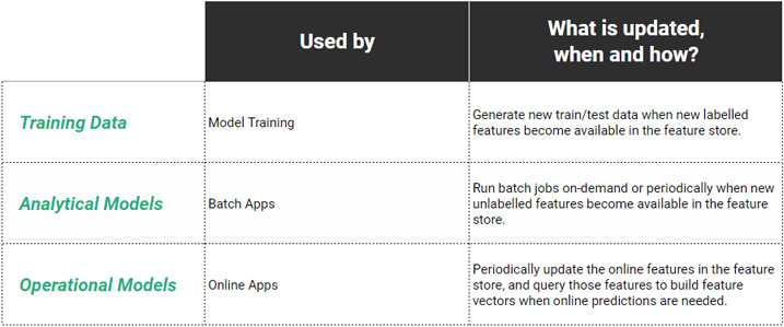 Data Warehouses verfügen in der Regel über zeitgesteuerte Auslöser zum Ausführen von ETL-Jobs (oder Datenpipelines), um die neuesten Daten aus Betriebsdatenbanken, Nachrichtenwarteschlangen und Data Lakes aufzunehmen. In ähnlicher Weise können Feature-Pipelines zeitgesteuerte Auslöser zum Transformieren und Aggregieren der neuesten Daten aus verschiedenen Quellen haben, bevor sie sowohl im Online- als auch im Offline-Feature-Store gespeichert werden, um von Online- und Offline-Anwendungen bewertet zu werden. Zusätzliche Pipelines können jedoch auch Features in den Feature Store einspeisen.