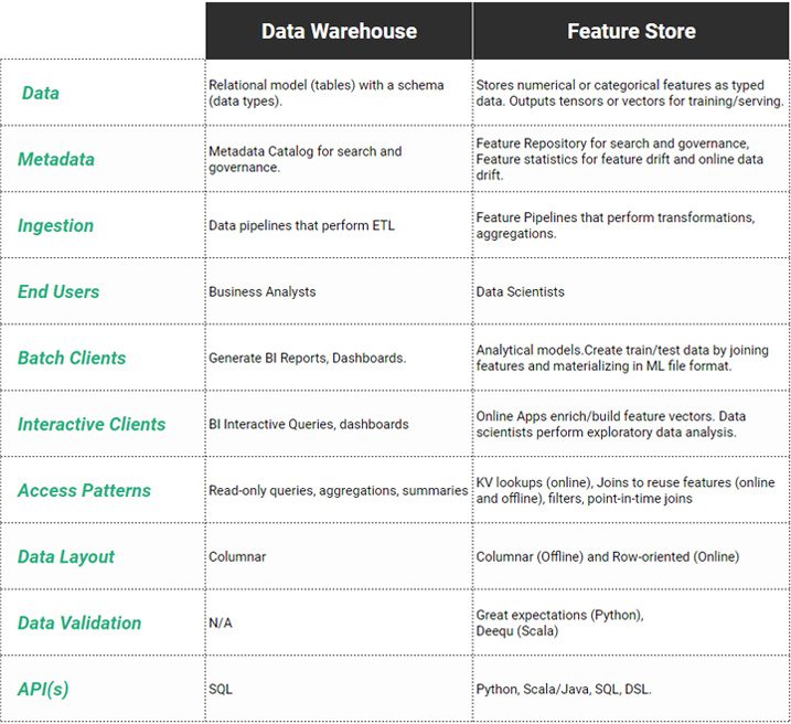 In der folgenden Tabelle sehen wir einen Überblick über die wichtigsten architektonischen Unterschiede zwischen Feature Stores und Data Warehouses. Data Warehouses werden hauptsächlich von Geschäftsanalysten für interaktive Abfragen und zum Erstellen historischer Berichte/Dashboards über das Unternehmen verwendet. Feature Stores werden sowohl von Datenwissenschaftlern als auch von Online-/Batch-Anwendungen verwendet und mit Daten über Feature-Pipelines versorgt, die normalerweise in Python oder Scala/Java geschrieben werden.