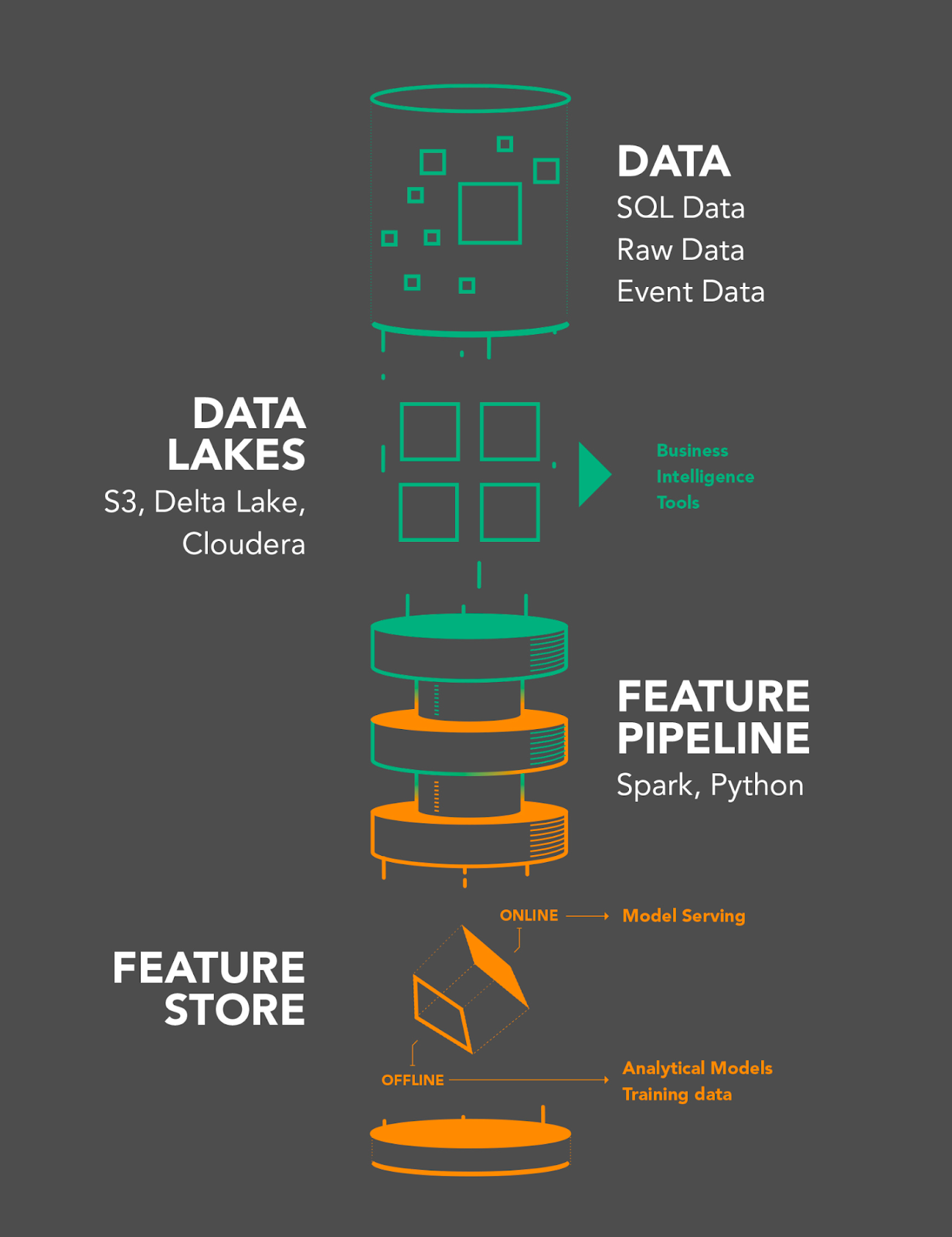 Heutzutage erstellen Data Scientists hingegen Vorhersagemodelle, um geschäftliche Erkenntnisse abzuleiten. Der Feature Store ist das Data Warehouse für Data Science – es ist ein zentraler Tresor zum Speichern dokumentierter, kuratierter und zugriffsgesteuerter Features, die in vielen verschiedenen Modellen verwendet werden können. Der Feature Store nimmt Daten aus den vielen verschiedenen Quellen des Unternehmens auf, nachdem er die Daten transformiert, aggregiert und validiert hat.