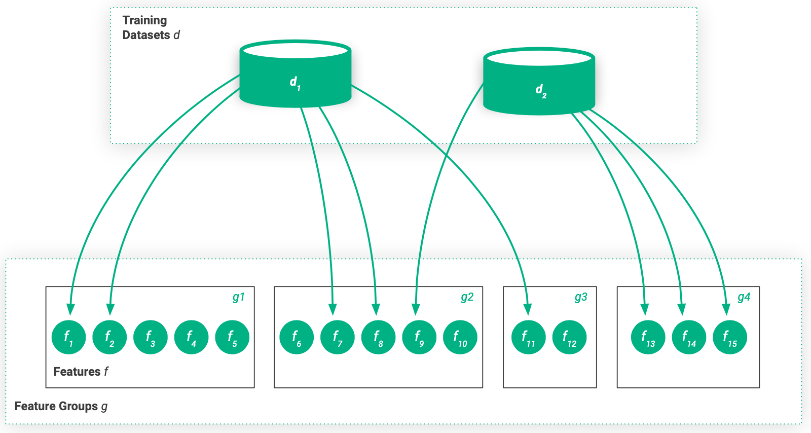 Abbildung 9. Eine Merkmalsgruppe enthält eine Gruppe von Merkmalen und ein Trainingsdatensatz enthält einen Satz von Merkmalen, möglicherweise aus vielen verschiedenen Merkmalsgruppen.