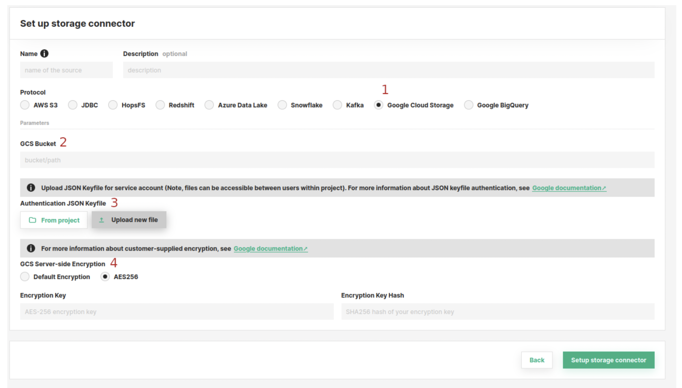 Our first step is to create a storage connector from the UI. In the screenshot below, we see an example of creating a storage connector for GCS. Detailed information about how to create a storage connector is found here.