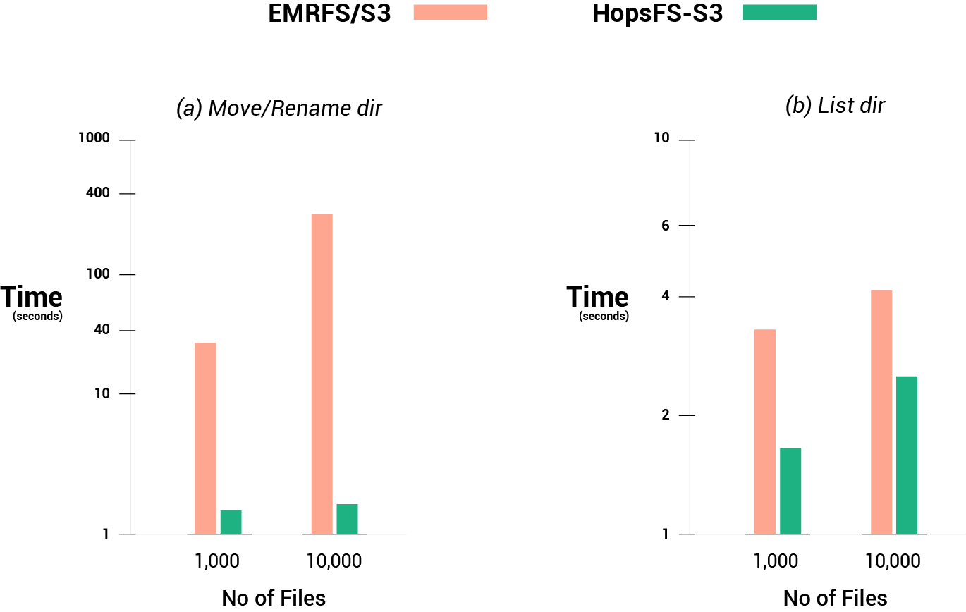 We compared the performance of EMRFS instead of S3 with HopsFS, as EMRFS provides stronger guarantees than S3 for consisting listing of files and consistent read-after-updates for objects. EMRFS uses DynamoDB to store a partial replica of S3’s metadata (such as what files/directories are found in a given directory), enabling faster listing of files/dirs compared to S3 and stronger consistency (consistent file listings and consistent read-after-update, although no atomic rename) .