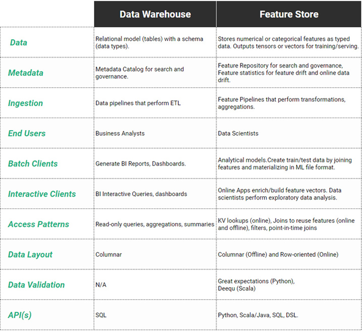 The table also shows the differences in the types of data stored, as well as how the data is stored, validated, and queried. A data warehouse stores data in tables along with schemas for describing the type of data and constraints for columns. Similarly, the feature store stores typed data (typically in tables), but as features are typically stored as ready-to-consume numerical values or vectors (embeddings) or tensors, there is less need for a richer set of column types compared to a data warehouse. Foreign key constraints are typically not supported in feature stores, due to the difficulty in enforcing such constraints between online and offline stores.