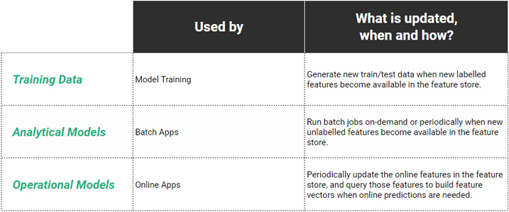 Predictions made by models can be stored in the feature store along with the outcomes for those predictions. There can be long lags of even days or months or years before outcomes become available - e.g., a prediction on whether a loan will be repaid or not), but as they arrive new training data becomes available that can be used to trigger re-training of models.