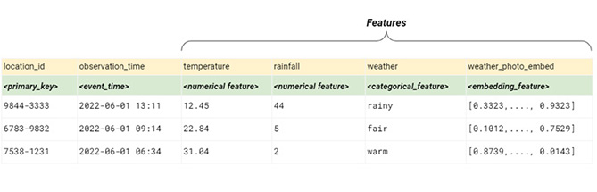 Features are saved in your feature store as tabular data, in a row/column layout where columns are the features and the rows contain the feature values along with an entity (or primary) key and an optional event_time column, indicating when the feature values were observed.