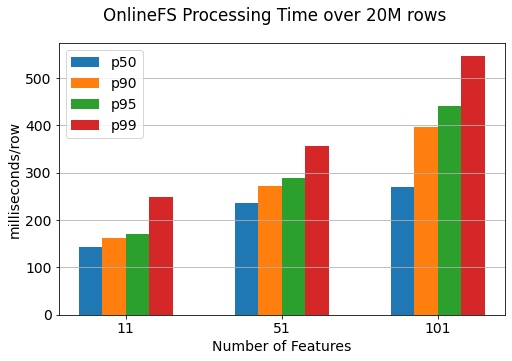 The processing times are reported on a per row basis, but parts of the pipeline within OnlineFS are parallelized, for example rows are committed to RonDB in batches of 1000. With this setup we achieve p99 of ~250ms for 11 features with a row size of 948 bytes.