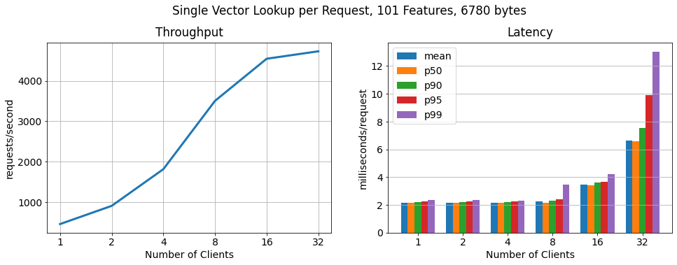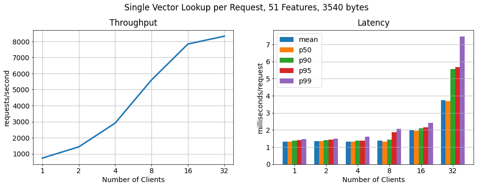We benchmarked throughput and latency for different feature vector sizes in relation to an increasing number of clients performing requests in parallel. Note that the clients were split among the two worker nodes (each 8vCPU).