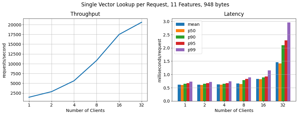 In this benchmark, every request contains one primary key value lookup (one feature vector). Throughput and latency scale linearly up to 16 clients while sustaining low latencies. With more than 16 clients we observed the hosts on which the clients are being run getting to their maximum CPU and network utilization. Furthermore, we did not see an over-utilization of the RonDB data nodes or the MySQL servers, which means we could further scale linearly by running the clients from larger worker instances or adding more worker hosts to run clients from.