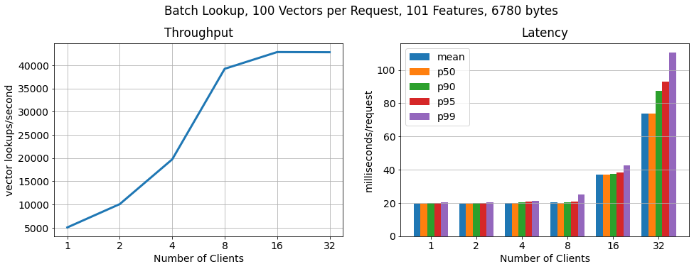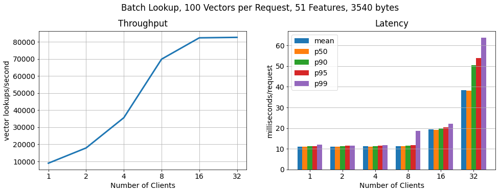 In order to show that RonDB scales to many more key lookups per second, we run another benchmark in which each client requests feature vectors in batches of 100. As we can see the number of lookups still scales linearly, lookup throughput increases by 15x, while the latency per request increases only moderately.