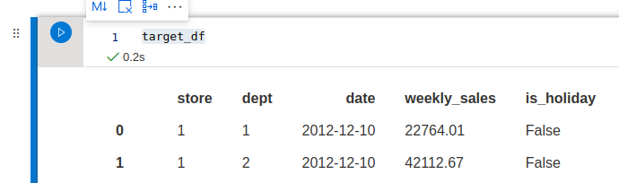Now, we can perform some feature engineering based on the pandas dataframe. We would like to predict the weekly sales of a department, so let’s create our target feature by selecting the last week available for each department:We can create this as a feature group, also containing the `is_holiday` feature, since, this information will be available at prediction time, there is no risk of data leakage.