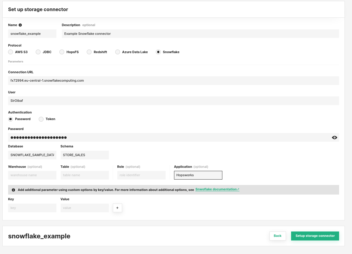 The Hopsworks Snowflake storage connector allows users to specify several additional fields, though only two are mandatory: the database field and the schema field.
