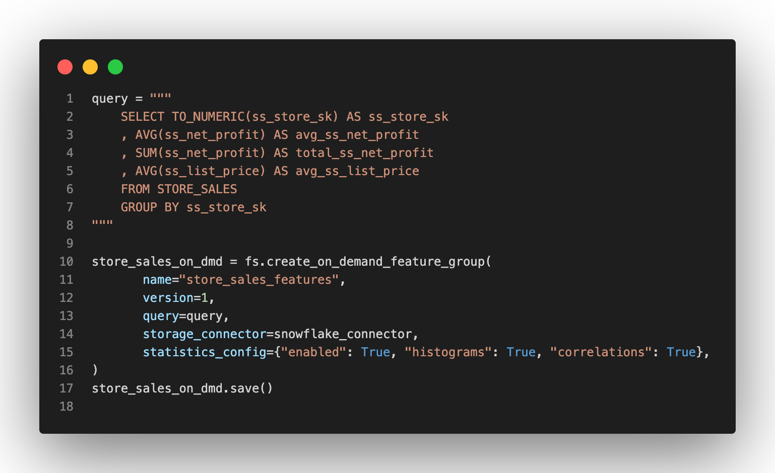 The above code defines avg_ss_net_profit, total_ss_net_profit and avg_ss_list_price as features in the store_sales_features feature group, and registers the feature group in the feature store.