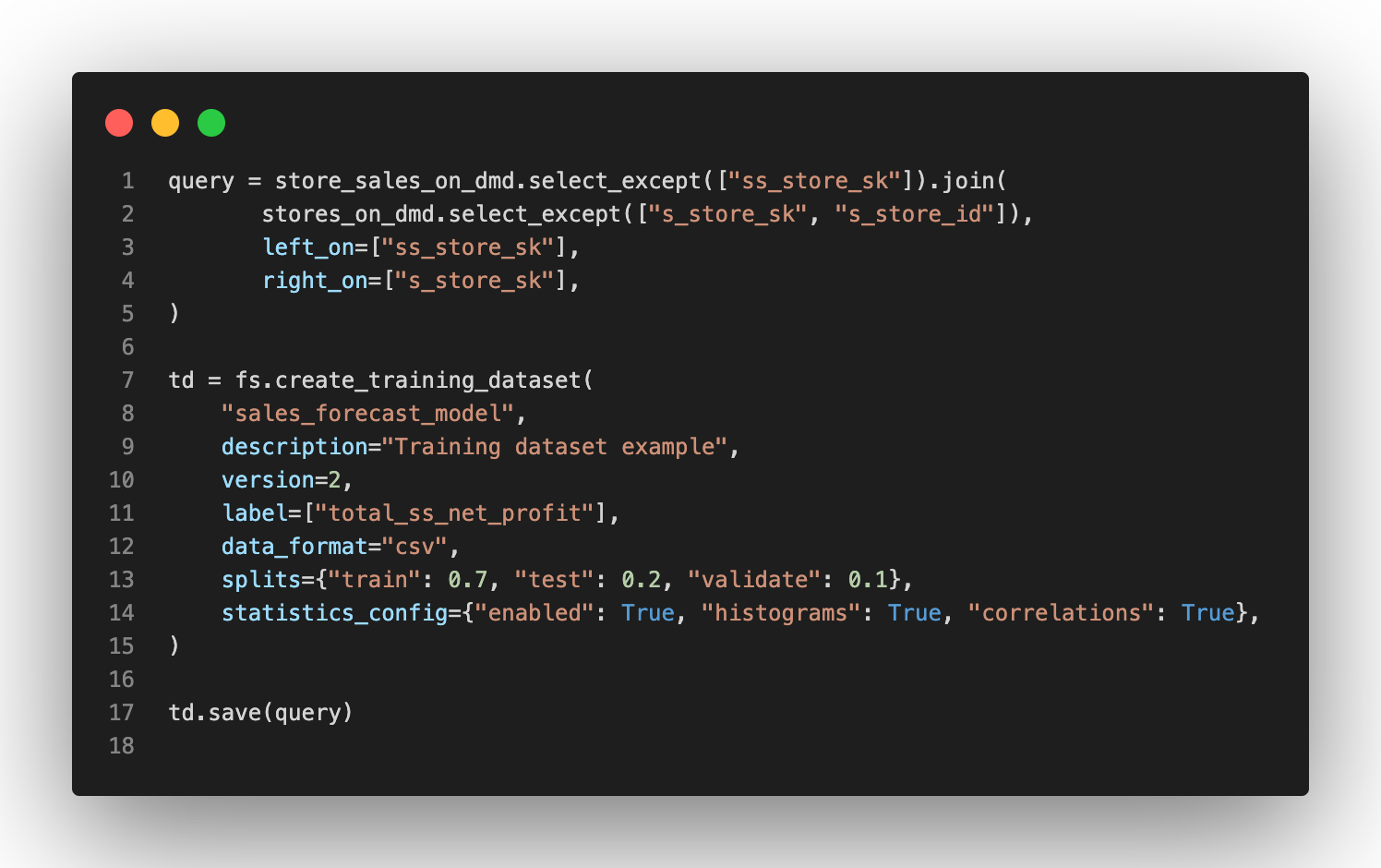 The training dataset in the example below is stored in TFRecords format ready to be used by a TensorFlow or Keras model. The training dataset itself can be stored on external stores like S3 or ADLS, as explained in the documentation.