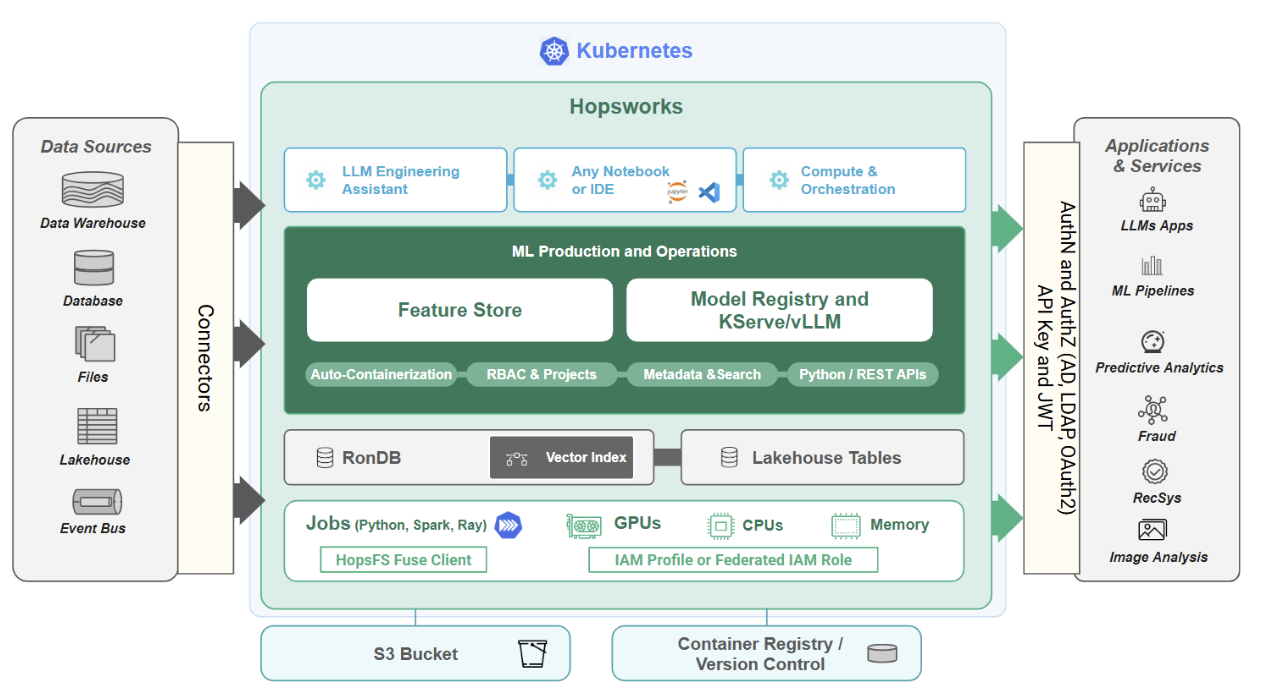 Hopsworks is an AI platform for developing and running batch, real-time and LLM AI systems at scale. Hopsworks includes a feature store (Lakehouse storage for historical data, and a real-time database (RonDB) for online feature serving), model serving with KServe, and many other services needed to support and run your feature, training, and inference pipelines. In Figure 1, you can see how Hopsworks uses connectors to access data sources and provides access to external services via API keys and single sign on (SSO) with Active Directory (AD) or OAuth2, and AuthZ with LDAP roles or OAuth2 claims.