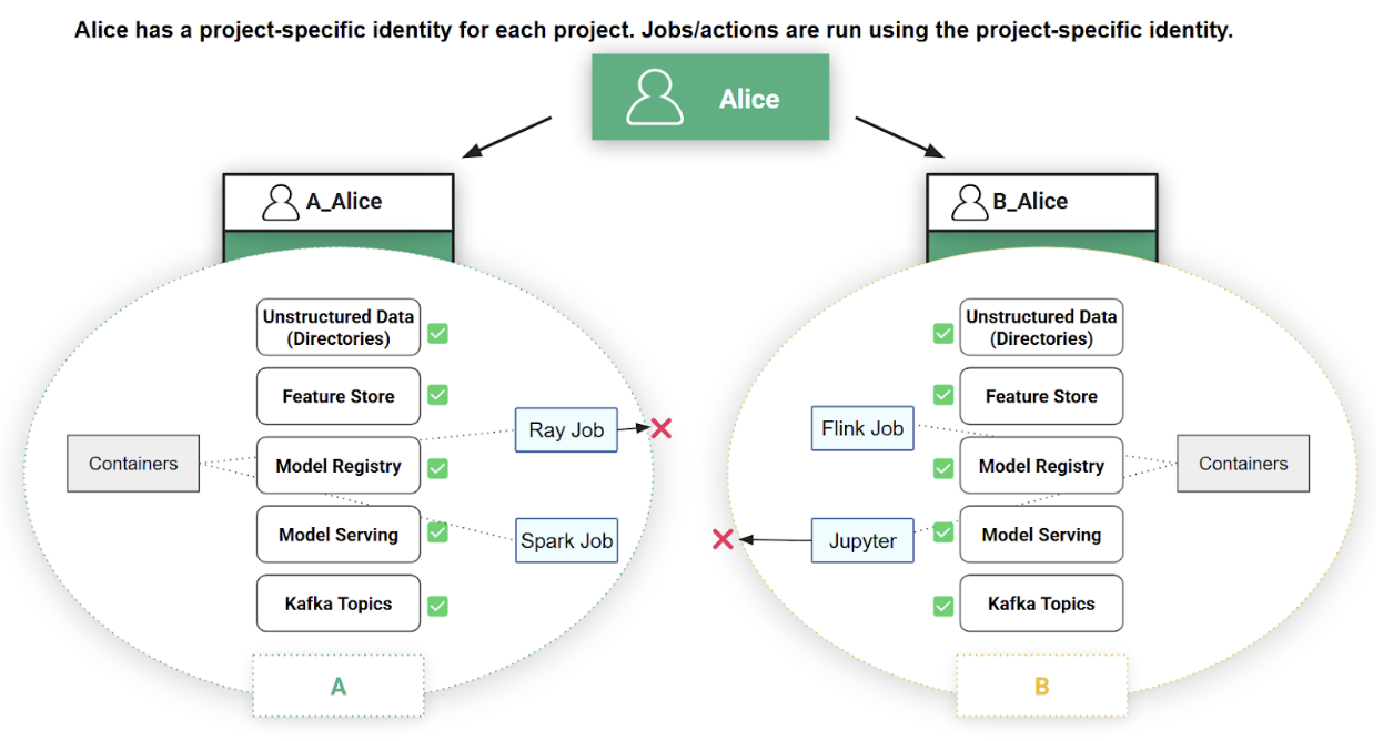 In Figure 4, you can see how Alice has a different identity for each of the two projects (A and B) that she is a member of. Each project contains its own separate private resources / assets. When Alice performs an action inside a project or runs a command/job, Hopsworks will perform that action with Alice’s project-specific user identity. This means that the Ray job that Alice started in project A can only access assets within project A, not assets in project B.