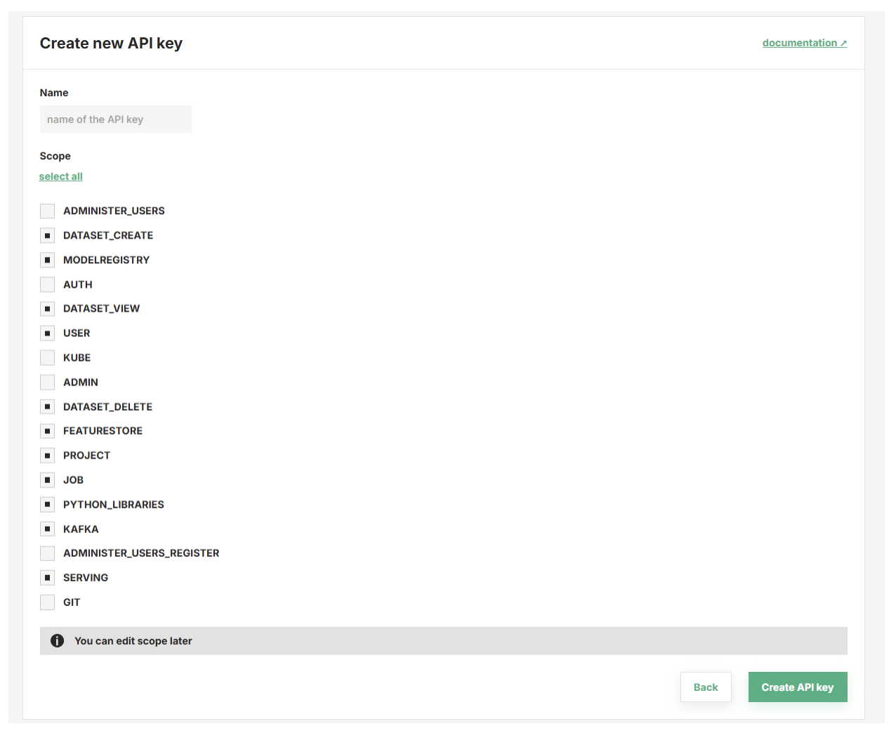 Hopsworks implements the project-user identity using a X.509 certificate issued internally by Hopsworks for every project-user identity. Platform services inside Hopsworks, including HopsFS and Kafka, are authorized and authenticated using the X.509 certificate. Note that Hopsworks also supports external clients (ML pipelines, etc) using API keys for services and JSON Web Tokens (JWT) for HTML clients. API keys provide scopes to restrict the use of different services by an API key and help you implement the principle of least privilege for external access, see Figure 5. For data that leaves Hopsworks, it naturally cannot prevent cross-linking of data across projects.