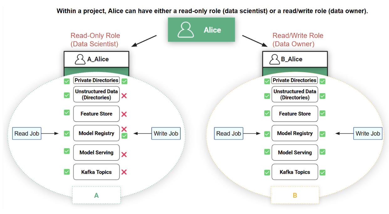For example, user Alice in Project A is different from user Alice in Project B, see Figure 4_._ In fact, Hopsworks creates two separate identities: ProjectA__Alice and ProjectB__Alice, respectively_._ As such, each project-user identity is effectively a role with the project-level privileges to access data and run programs inside that project. If a user is a member of multiple projects, she has, in effect, multiple possible roles, but only one role can be active at a time when performing an action inside Hopsworks. When a user performs an action (for example, runs a Job or deploys a model) it will be executed with the project-user identity. That is, the action will only have the privileges associated with that project. You can only run jobs or access data with your project-user identity. Hopsworks also supports project-level service accounts to run jobs, workflows, and deployments.
