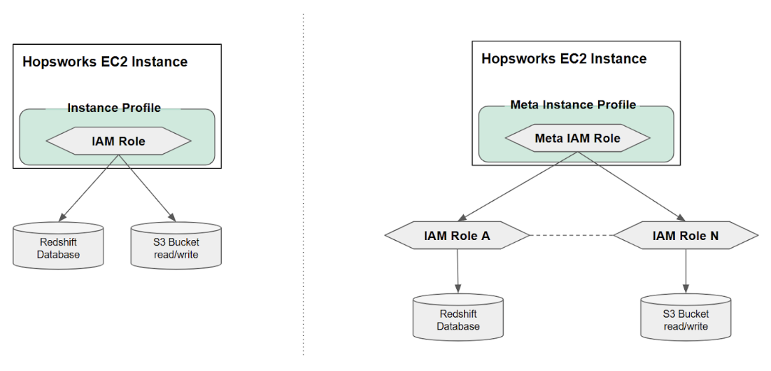 In Figure 8, you can see that jobs run in Hopsworks can either be given an instance profile (with IAM role privileges to access cloud services) or a federated IAM role (a chained role) with temporary access to cloud services.