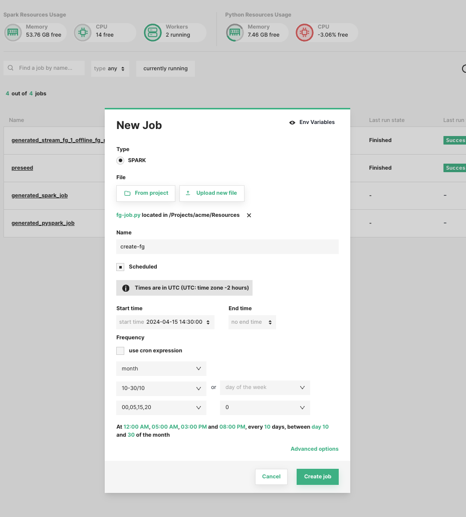 As shown in the figure below, a user of Hopsworks through the UI has a number of different options when setting up a job to run. In the job scheduling dialog, a user has the option of specifying whether the job is to be run using Spark or as a standalone python job. The specific code to be run as part of this job can be specified by the user along with passing any additional optional arguments.