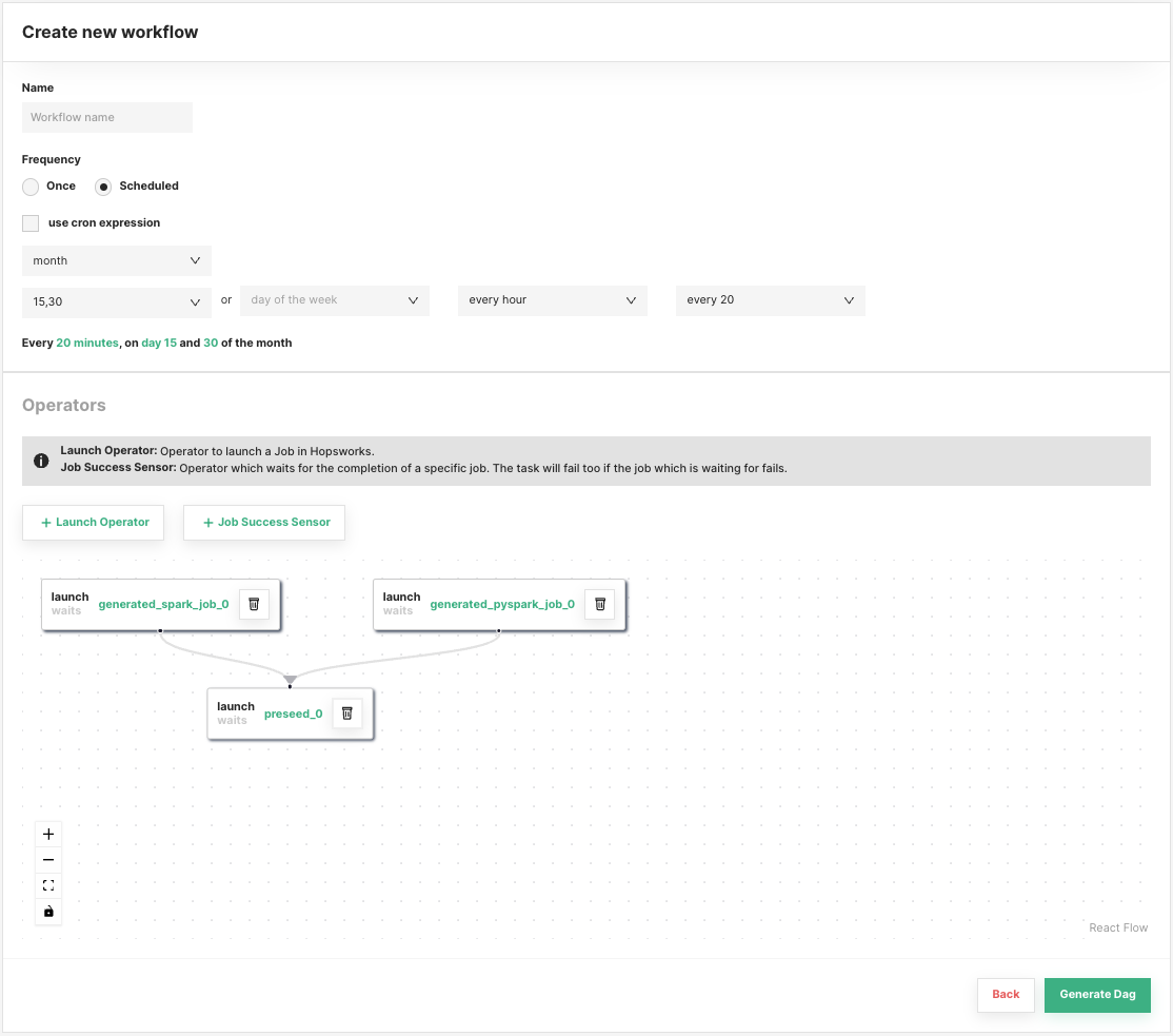 In Hopsworks Airflow DAG jobs are simply python files within which different operators can be used to trigger different actions (e.g., waiting for a job to finish). To create a new Airflow DAG to orchestrate jobs, the Hopsworks DAG builder tool is used to create a new workflow. A Hopsworks DAG can include different Airflow operators and sensors to orchestrate the execution of jobs. Both the DAG builder tool or the git version control system can be used to make updates to a particular DAG python file.
