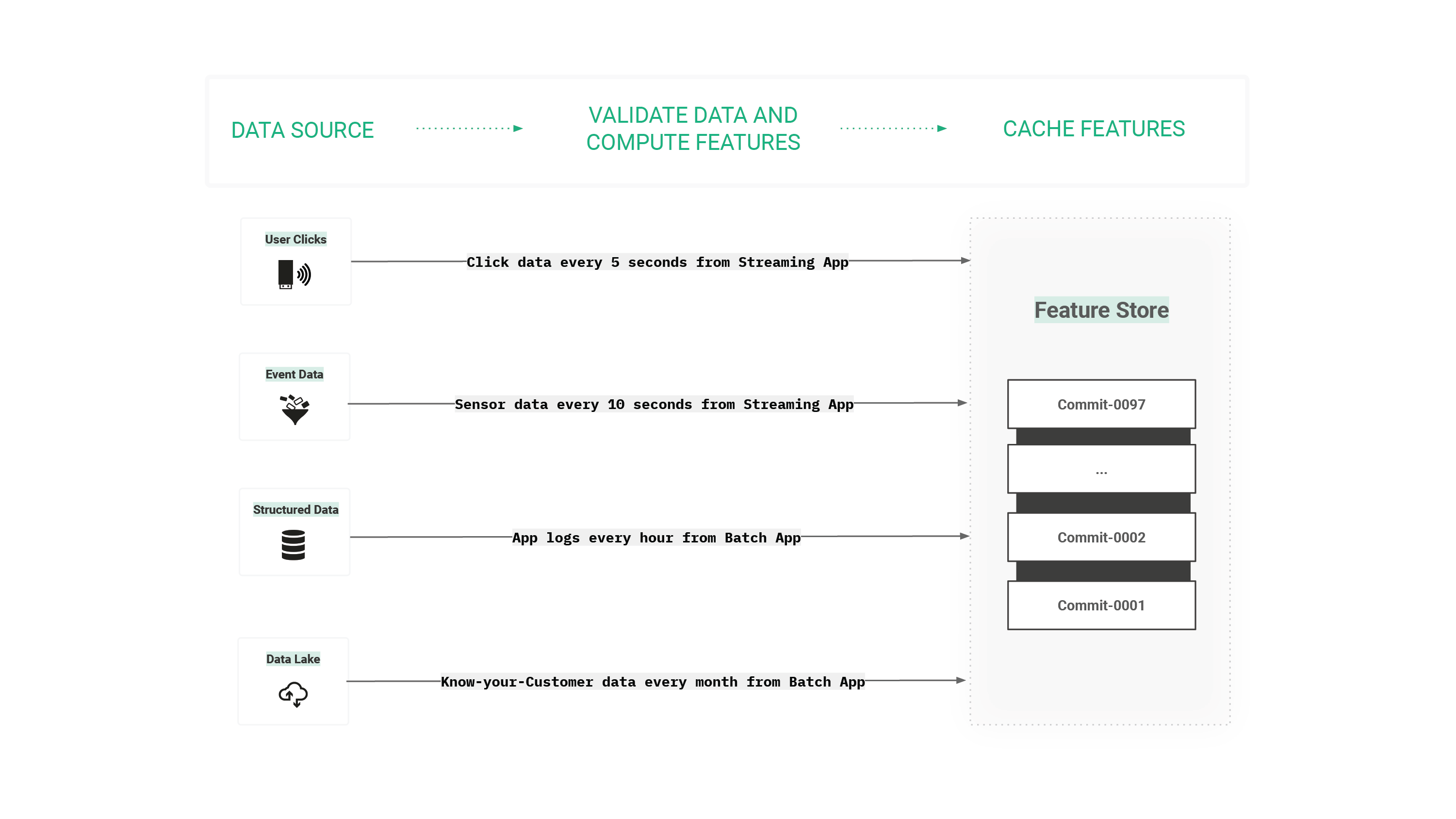 The feature store enables feature pipelines to cache feature data for use by many downstream model training pipelines, reducing the time to create/backfill features. Groups of features are often computed together and have their own natural ingestion cadence, see figure above. Real-time features may be updated in the online feature store every few seconds using a streaming application, while batch features could be updated hourly, daily, weekly, or monthly.
