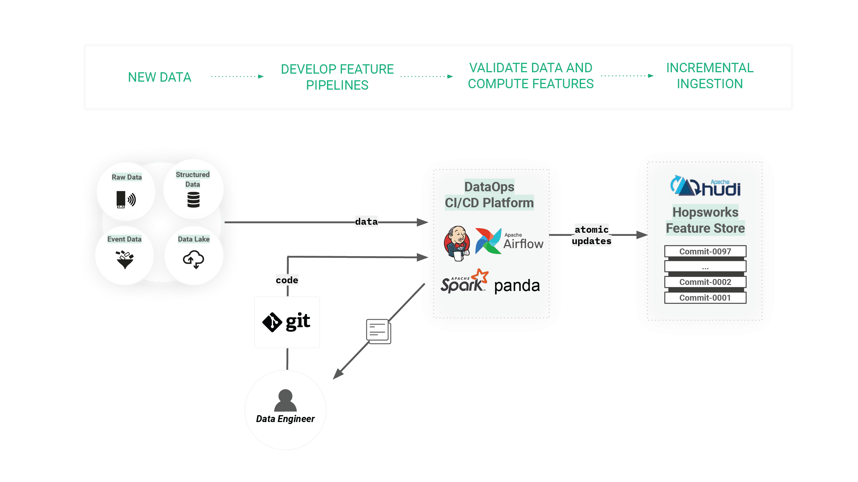 When a feature store is available, the output of feature pipelines is cached feature data, stored in the feature store. Ideally, the destination data sink will have support for versioned data, such as in Apache Hudi in Hopsworks Feature Store. In Hopsworks, feature pipelines upsert (insert or update) data into existing feature groups, where a feature group is a set of features computed together (typically because they come from the same backend system and are related by some entity or key). Every time a feature pipeline runs for a feature group, it creates a new commit in the sink Hudi dataset. This way, we can track and query different commits to feature groups in the Feature Store, and monitor changes to statistics of ingested data over time.