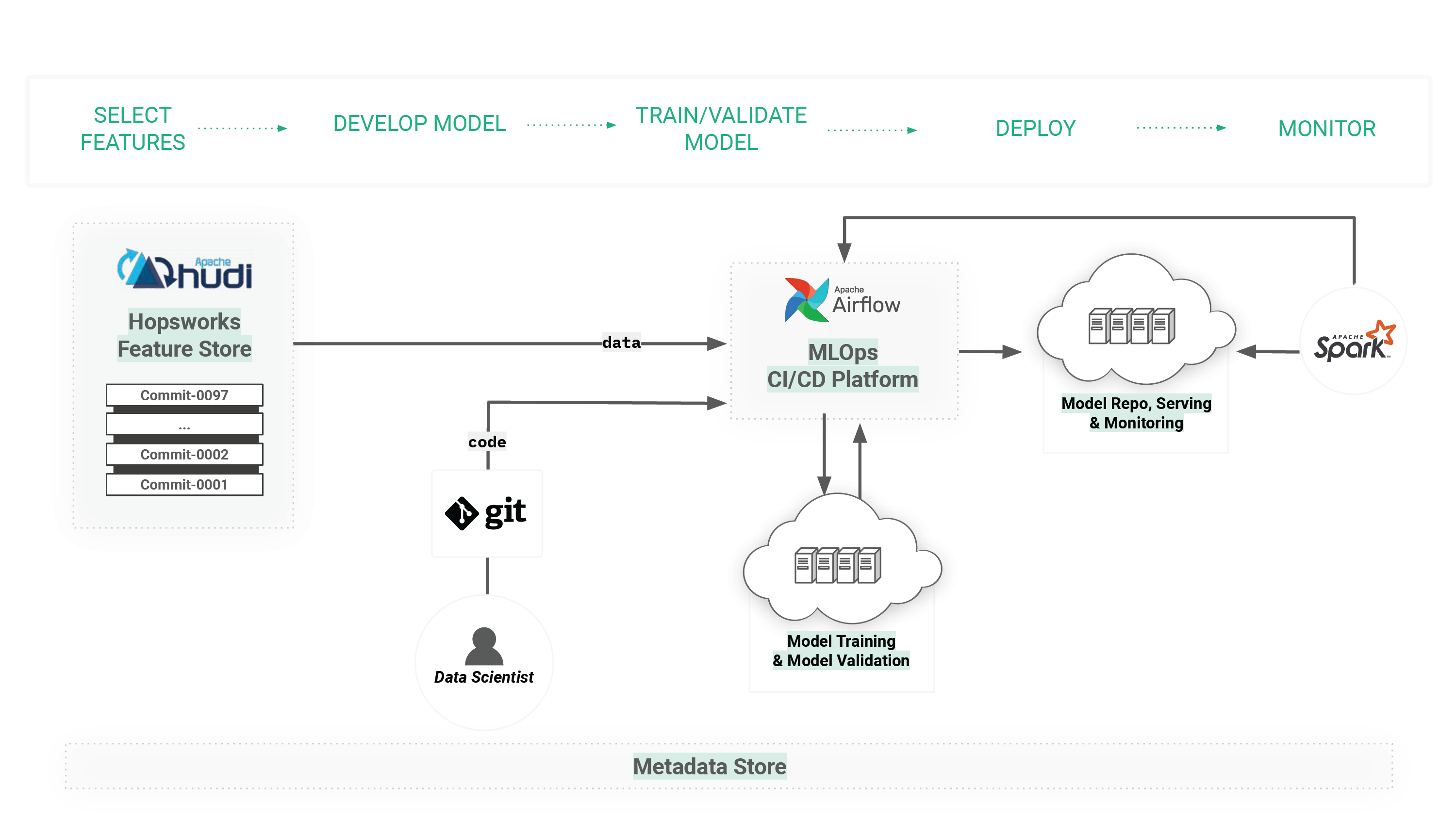 Figure 7. Model training pipelines belong to the MLOps paradigm, where versioned features are read from Apache Hudi in the Hopsworks Feature Store to create train/test data that is used to train models that are then deployed and monitored in production. Provenance of ML artifacts and executions are stored in the Metadata store in Hopsworks, and ML pipelines are orchestrated by Hopsworks.