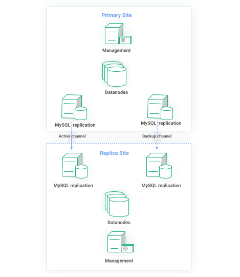 The replication happens between two designated MySQL servers. Remember that in RonDB MySQL are just lightweight API processes so they come at almost no cost. Every connected MySQL node will receive committed transactions and write them to its binlog. The MySQL server on the Replica site is configured to receive events from the Primary site and consequently apply the transaction. In the example of Figure 3, there are two replication channels. The active is doing the replication while the backup is ready to automatically take over if it detects replication has not made any progress.