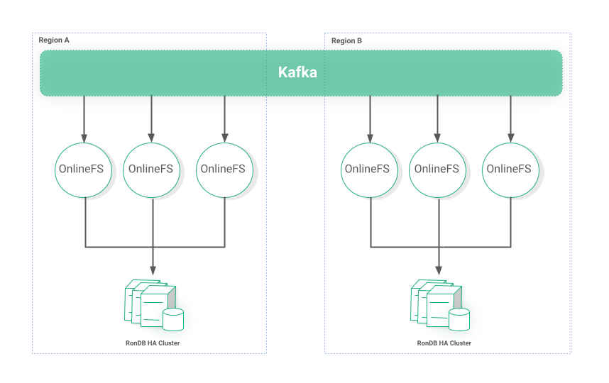 Often big organizations have a dedicated team to administer Kafka clusters and provide multi-region stretched Kafka topics. If this is not an option we can achieve a similar result with a tool such as Kafka MirrorMaker. The end-goal is to have the same Kafka message be delivered to both regions. The onlinefs microservices will guarantee to store the data in their respective disjointed RonDB clusters as shown in Figure 5.