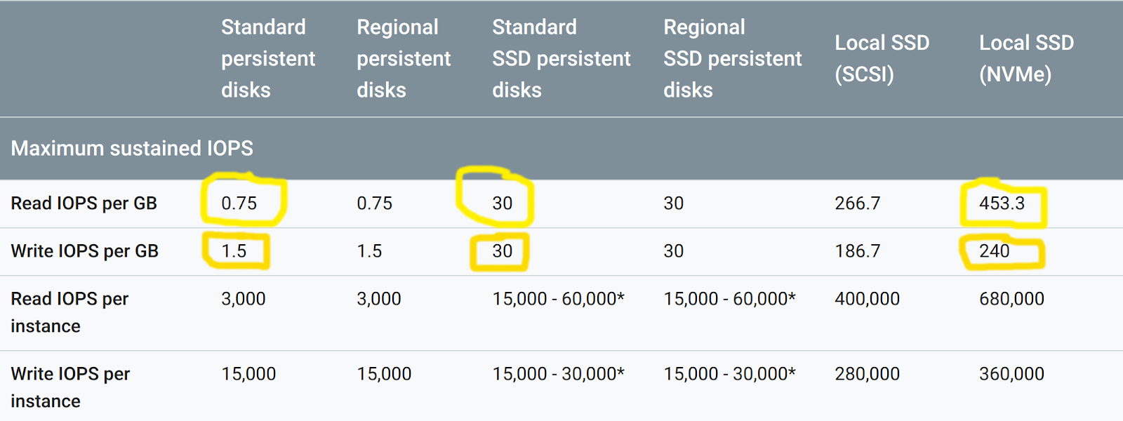 As we can see from Google Cloud disk performance figures, NVMe disks support more than 2 orders of magnitude more IOPs than magnetic disks, and over 1 order of magnitude more IOPs than standard SSD disks.