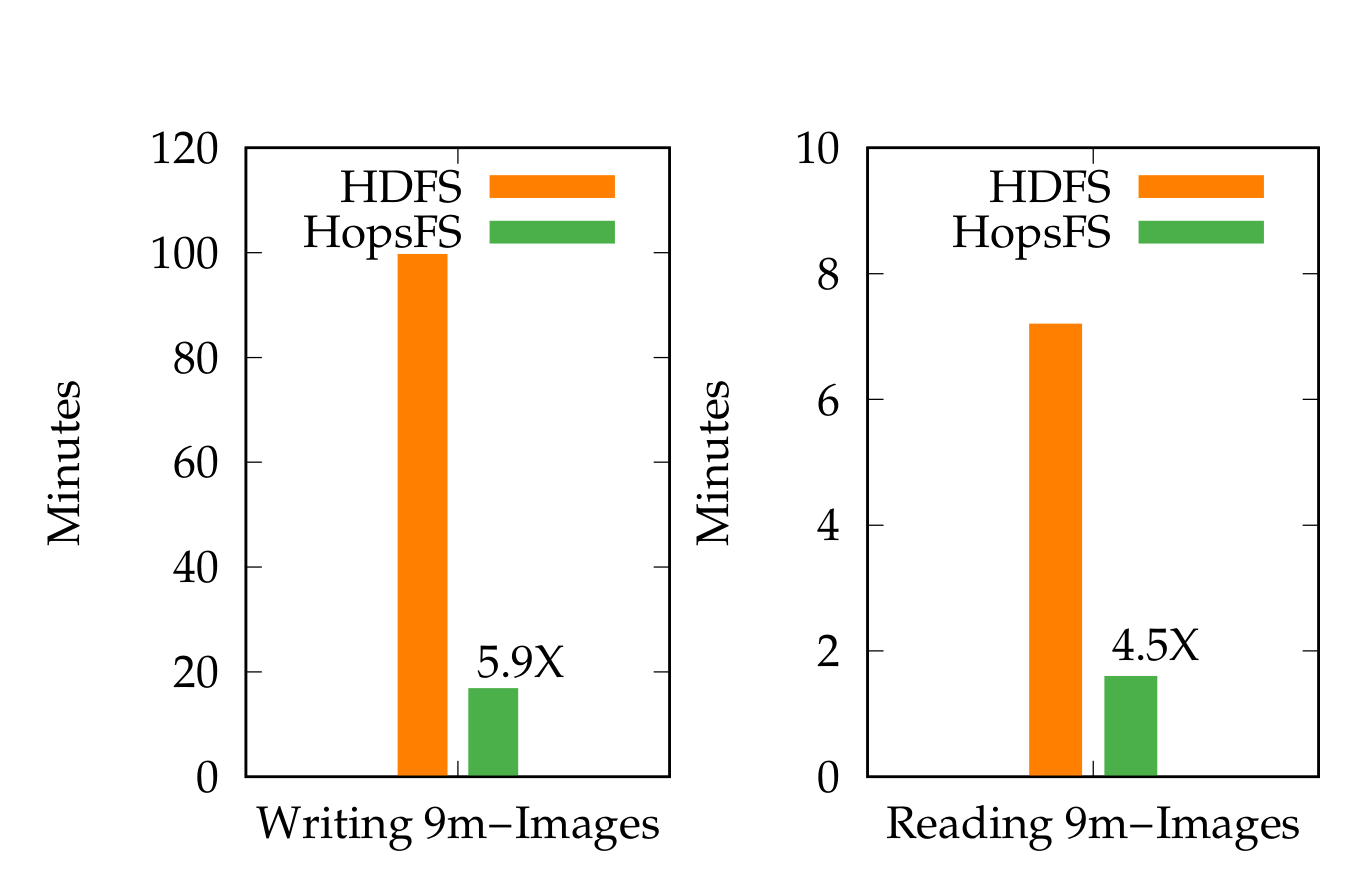 In our Middleware paper, we observed up to 66X throughput improvements for writing small files and up 4.5X throughput improvements for reading small files, compared to HDFS. For latency, we saw operational latencies on Spotify’s Hadoop workload were 7.39 times lower for writing small files and 3.15 times lower for reading small files. For real-world datasets, like the Open Images 9m images dataset, we saw 4.5X improvements for reading files and 5.9X improvements for writing files. These figures were generated using only 6 NVMe disks, and we are confident that we can scale to much higher numbers with more NVMe disks.