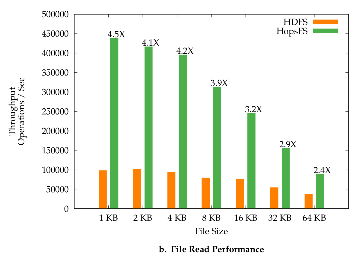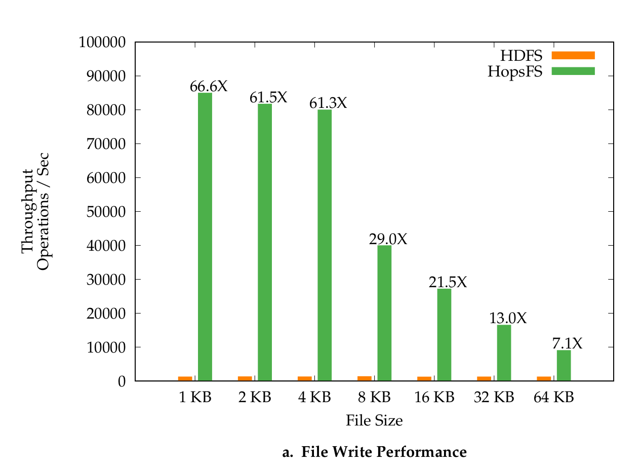 The result is that when clients read and write small files, they can do so at an order of higher magnitude in throughput (number of files per second), and with massively reduced latency (>90% of file writes on the Spotify workload completed in less than 10ms, compared to >100ms for Apache HDFS). In HopsFS, most incredibly, the small files stored at the metadata layer are not cached and are replicated at more than one host. That is, the scale-out metadata layer in HopsFS, can be scaled out like a key-value store and provide file read/write performance for small files compatible with get/put performance for modern key-value stores.