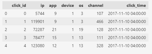 Looks like our dataset is consuming a little over 1 gigabyte of memory. We also see that it contains 7 columns, all of which are inferred as int64 except for `click_time`, which is loaded as an object. Our first step will be to convert this into a datetime type.