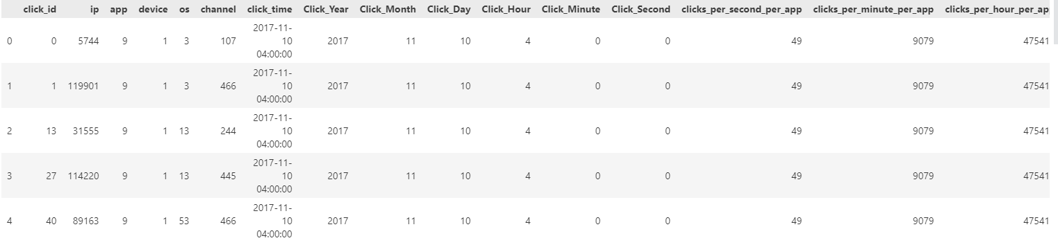 Now, it's time for some complex calculations. For further feature engineering, we will calculate the number of clicks an app gets on an advertisement per second, minute, and hour. This will require us to apply a `groupby` clause across the time features and count the number of occurrences against the app id. Then we will append the values back to the dataframe using the join operation. We will monitor the performance of all these actions combined to get a realistic view of how Pandas perform.