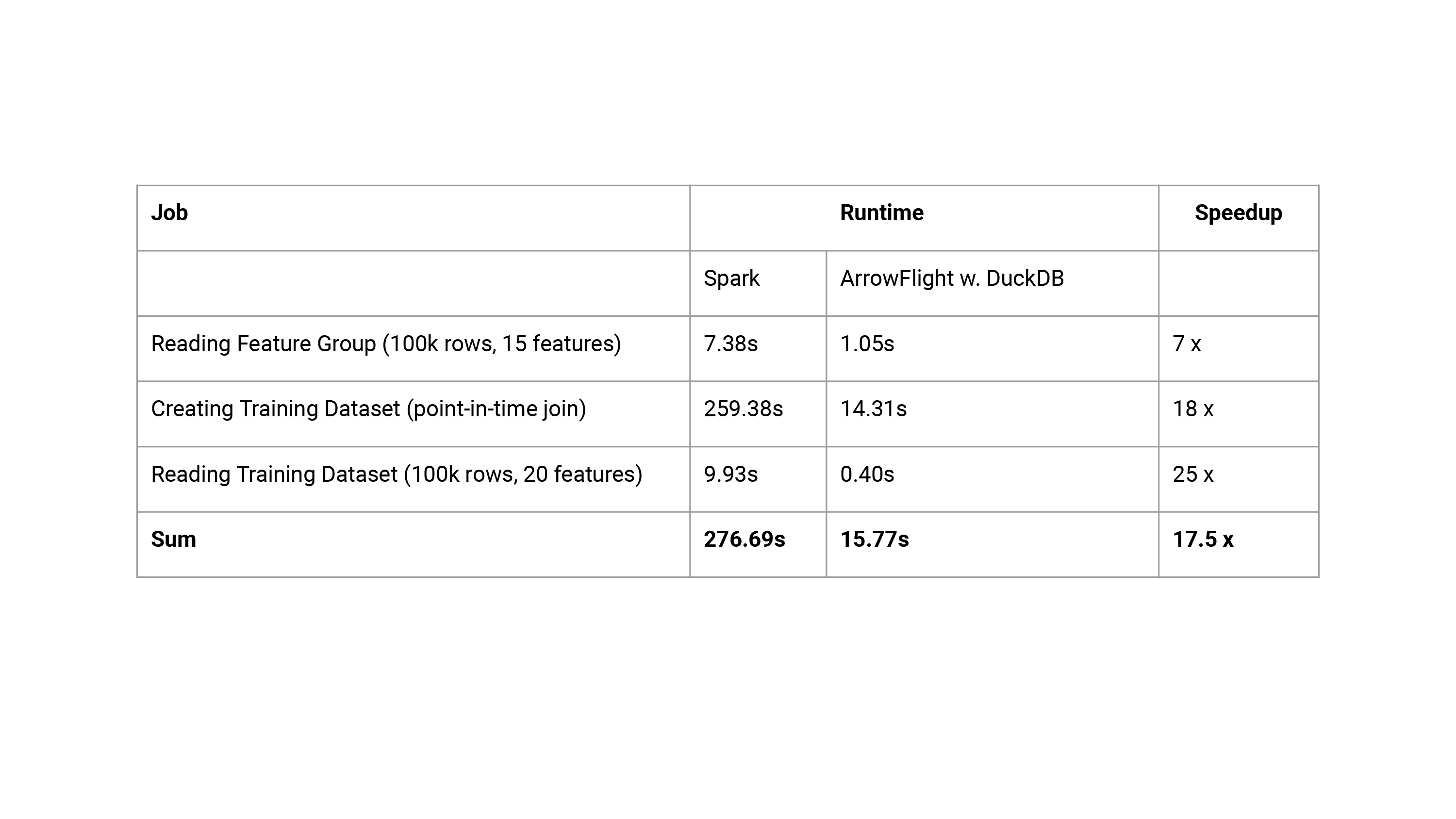 In tables 1,2, you can see a summary of the speedup we observed when using DuckDB/ArrowFlight for moderately sized data, compared to existing feature stores. The details are in the benchmark section below.