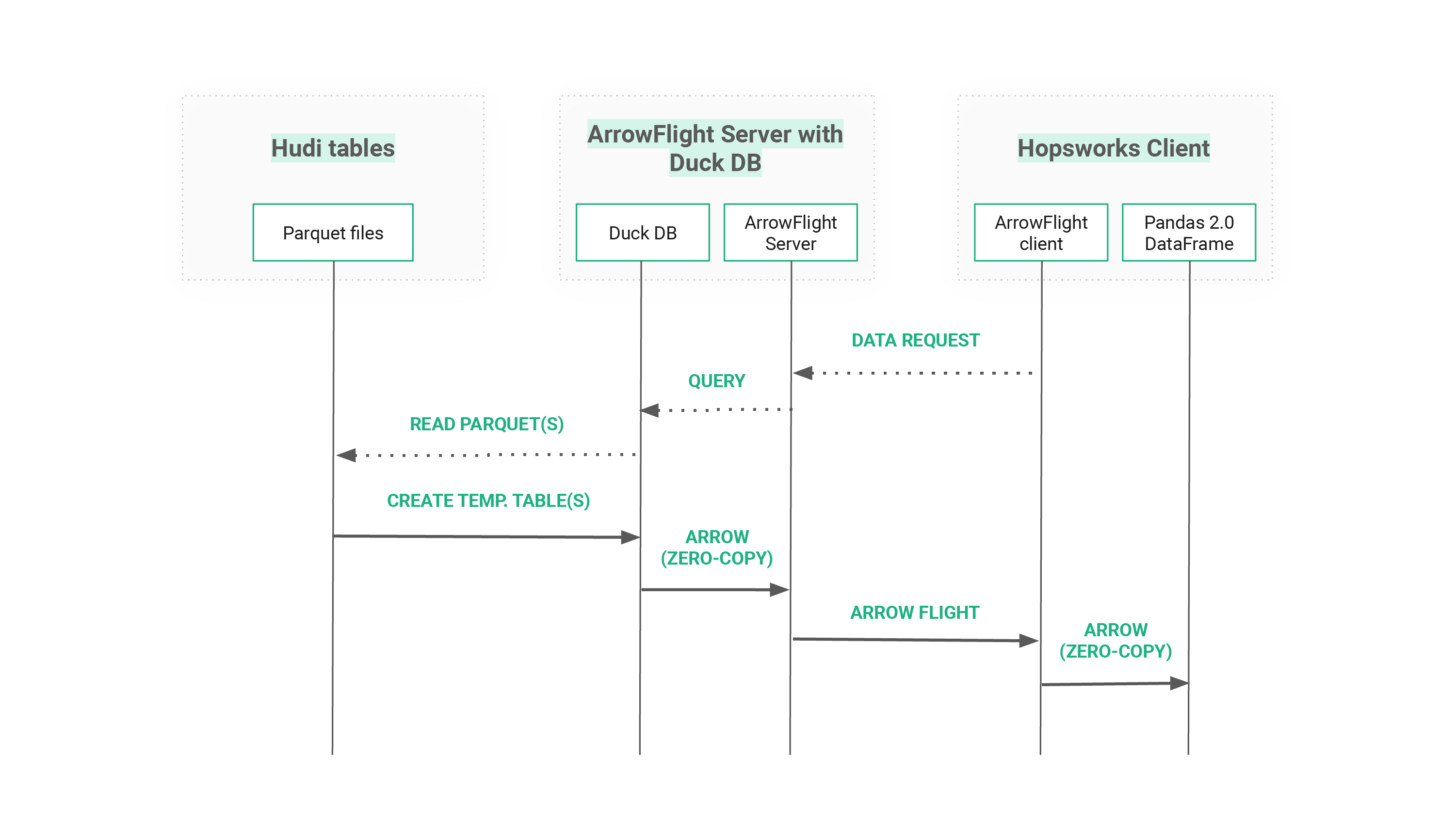There are no API changes needed for Hopsworks clients to use ArrowFlight with DuckDB in the Python client, beyond upgrading to Hopsworks 3.3+. All notebooks and Python scripts you built with Hopsworks can remain the same. Once a cluster is deployed with “ArrowFlight Server'' (see installation guide), the following operations will automatically be performed by the new service: