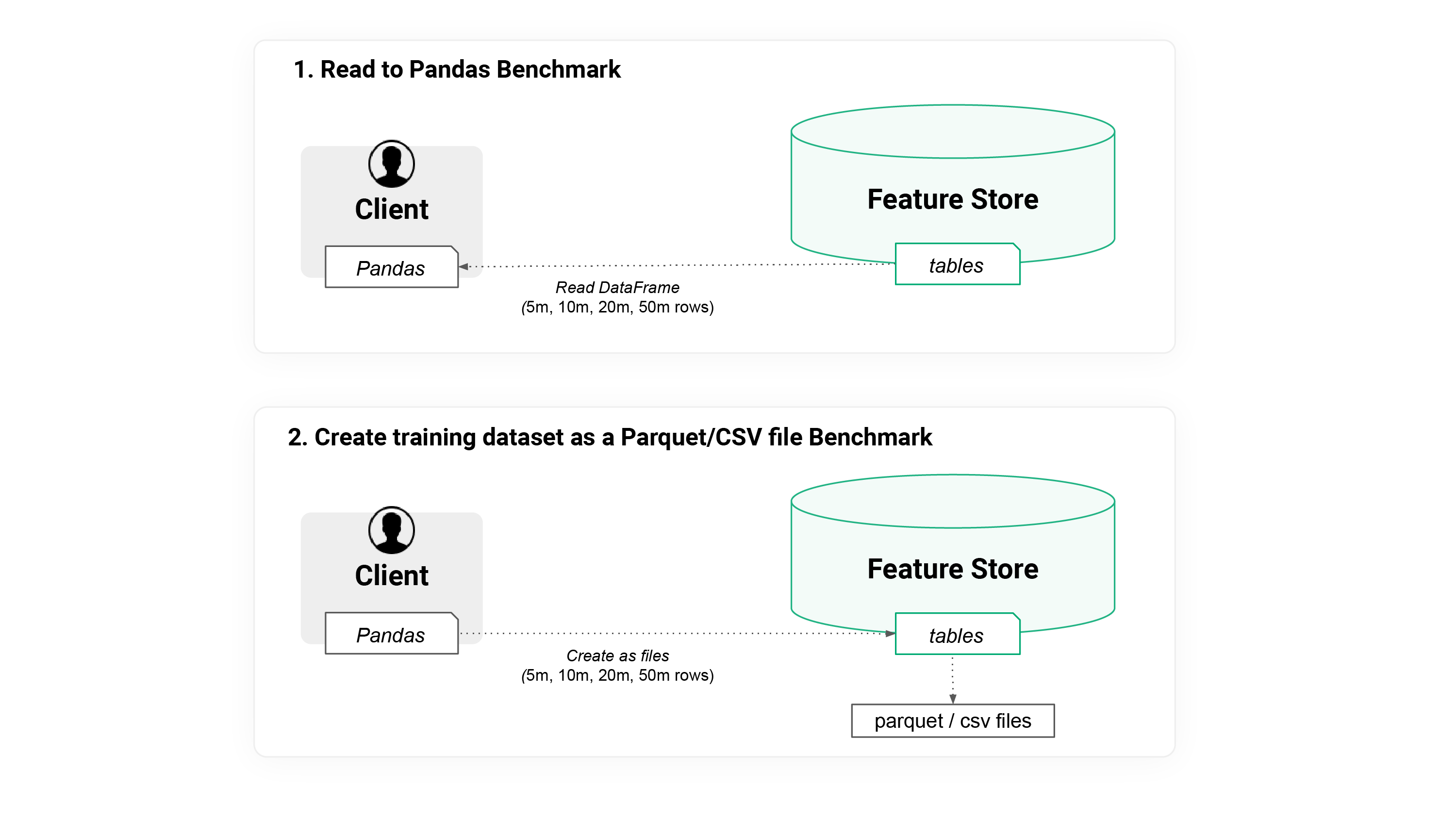 As such, we provide benchmarks for both (1) the Read an In-Memory Pandas DataFrame use case and the (2) create feature data (training data) as files.
