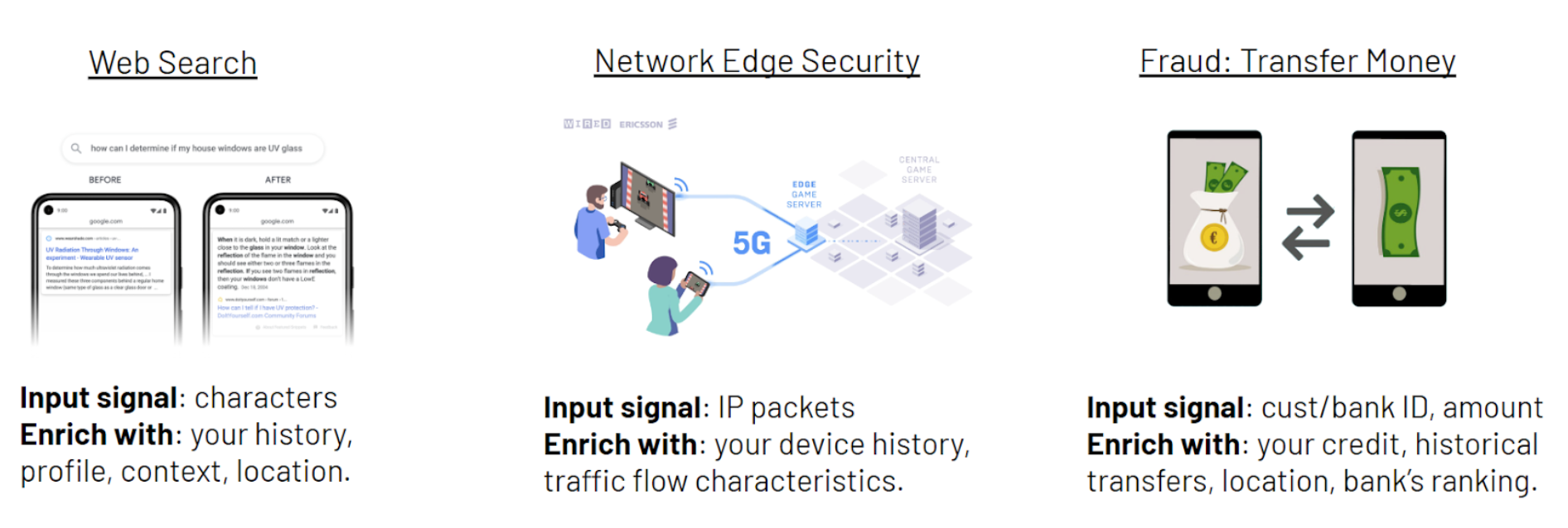 Many real-time AI systems make decisions based on information poor signals - a user swipe generates recommendations, a single credit card payment is checked for fraud, or network packet is evaluated for network intrusion. All of these systems make better decisions when they can augment the signal with historical and contextual information retrieved using one or more entity identifiers extracted from the weak signal - a user ID, a credit card number, or an IP traffic flow.